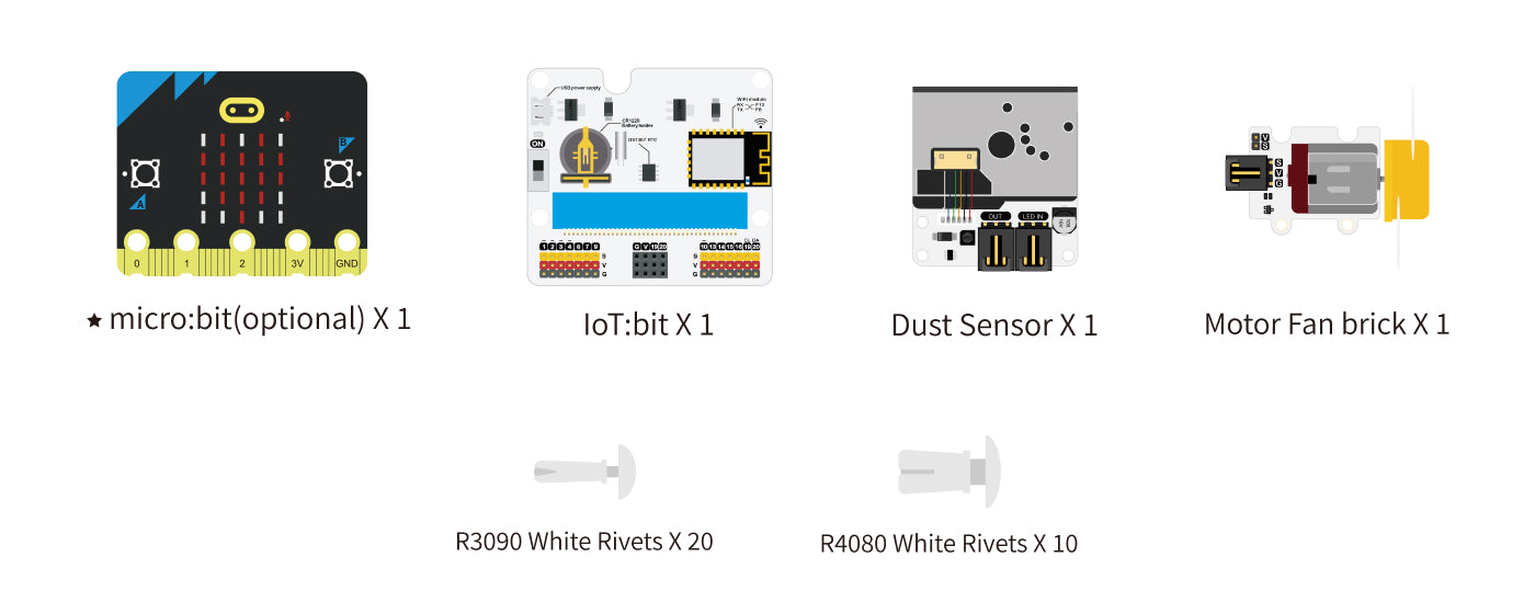 The ELECFREAKS Classroom Smart Air Purifier Kit includes components such as the IOT: bit expansion board, motor fan, and dust sensor. These components can achieve rich functions and perfectly match with the micro: bit development board, allowing you to explore more interesting smart homemaker projects.